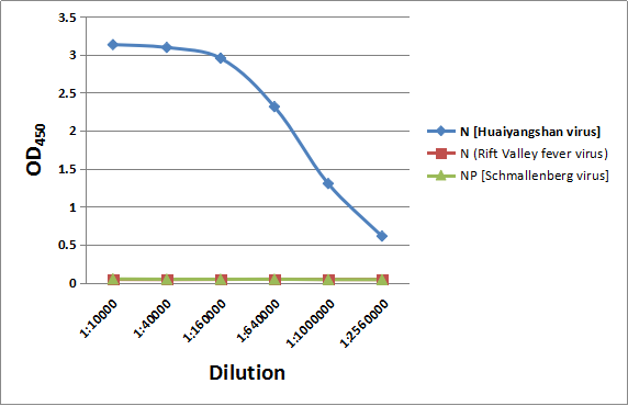 - Specificity: Reacts specifically with NP (SFTS Virus)(Huaiyangshan Virus). Minimal cross-reactivity to other Bunyavirus nucleocapsid protein.
